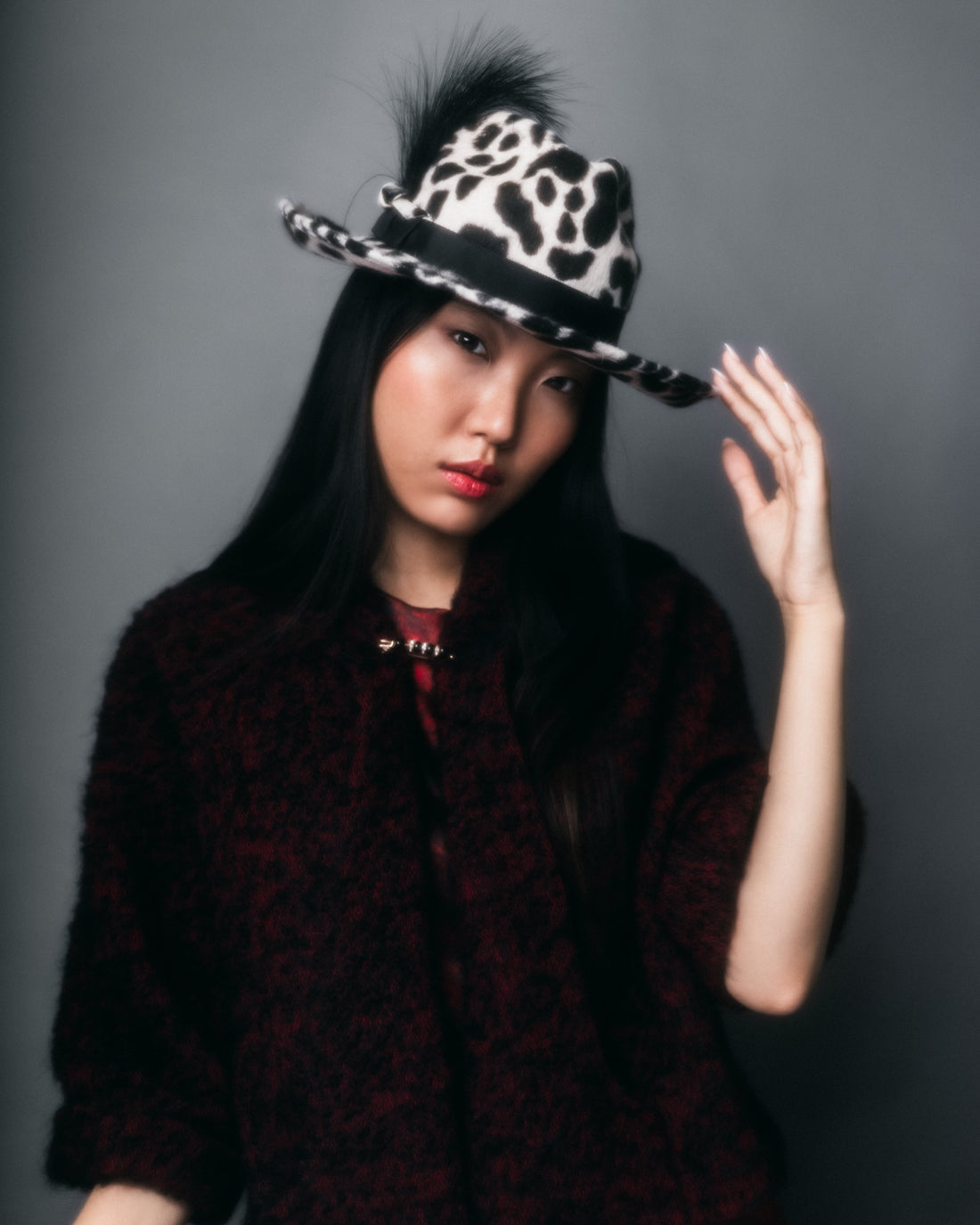 Make a bold statement with Brume, a striking headpiece crafted from luxurious long-haired velour felt...