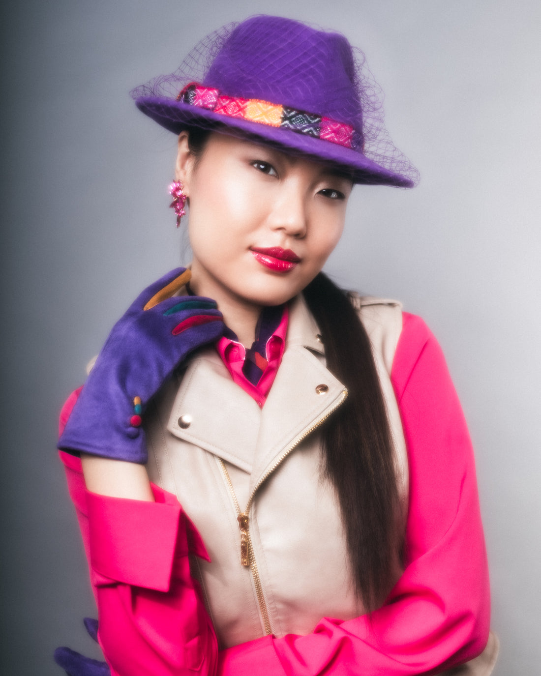 A rich purple peachbloom velour felt hat, adorned with a multicoloured bohemian band and bow,...