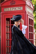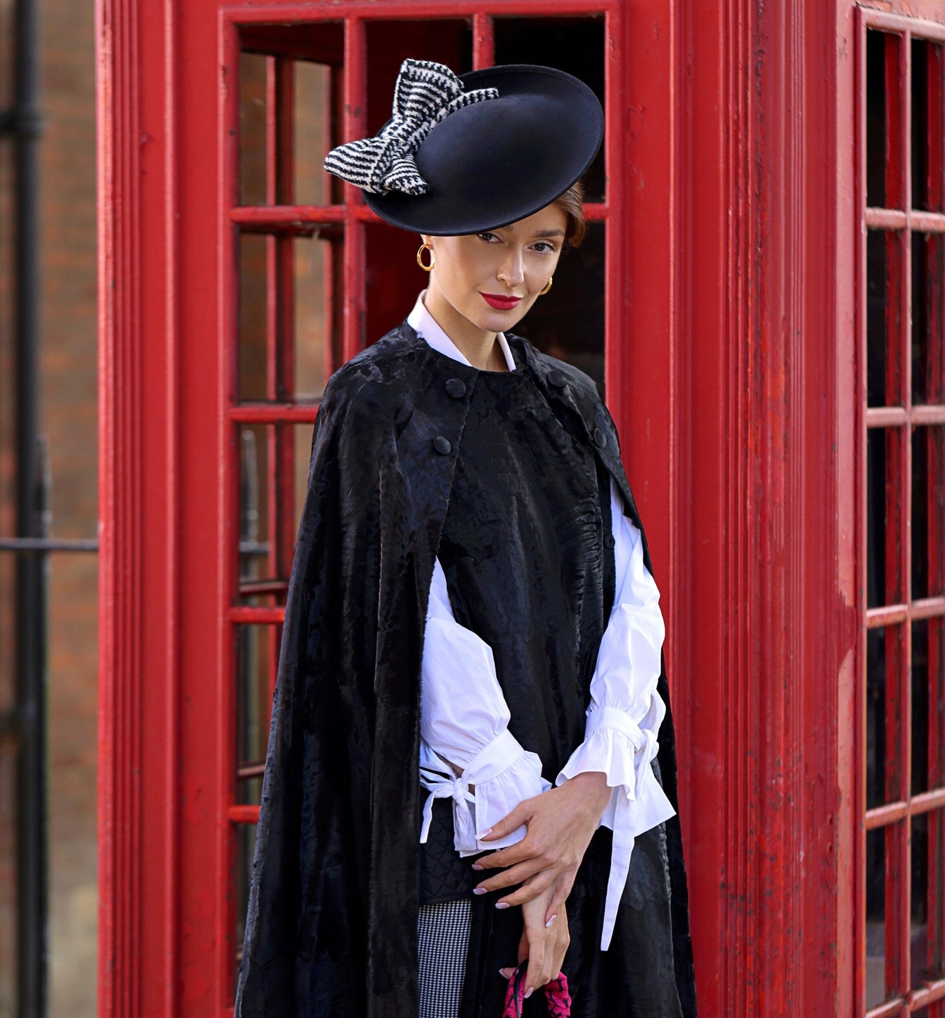 The Aosta headpiece is a silky black peachbloom felt disc, carefully decorated with a handmade monochrome French vintage fabric side bow.