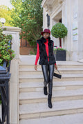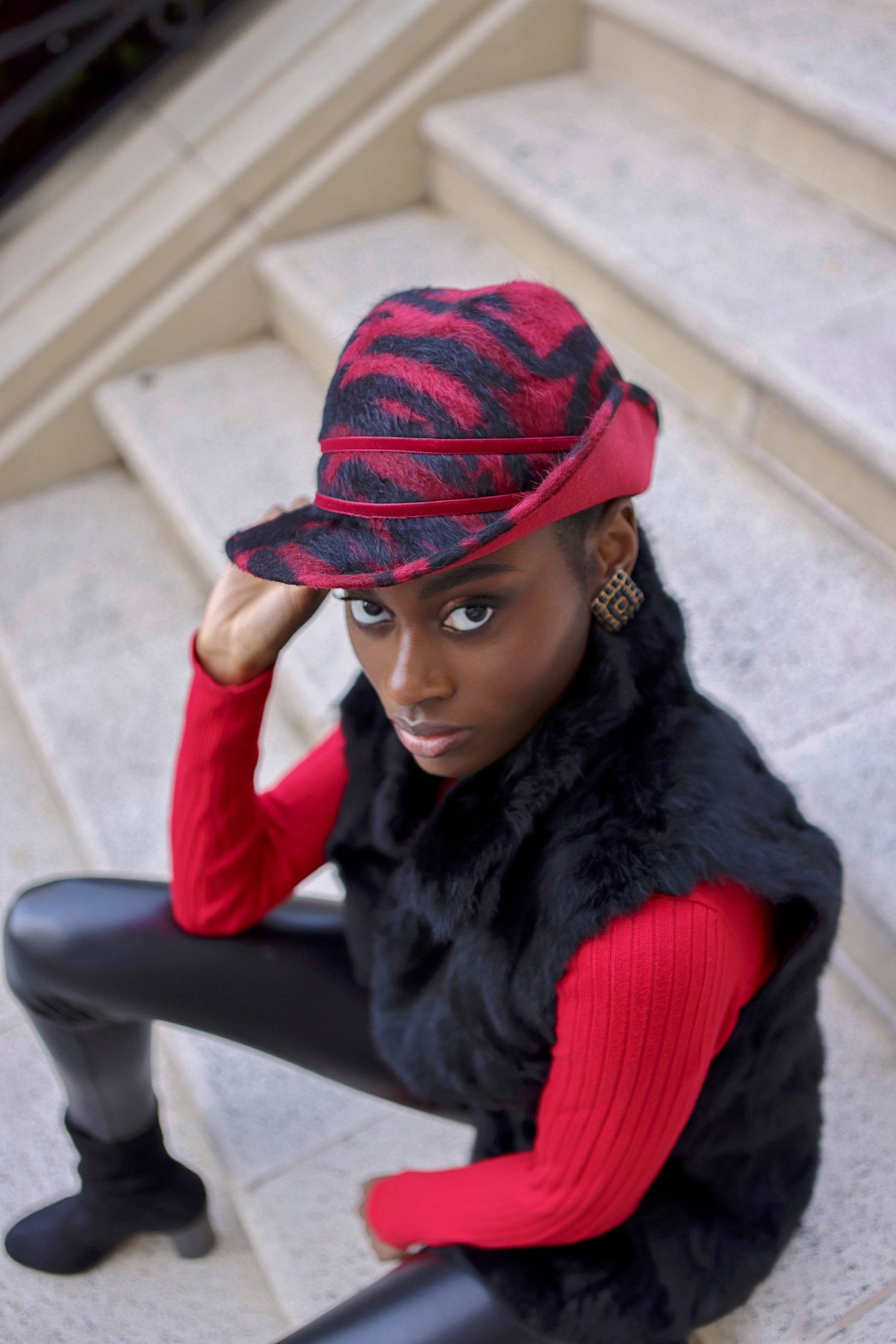 The Aroscia headpiece is a short brimmed Trilby made from a silky red and black animal print velour felt and decorated with a red velvet band.