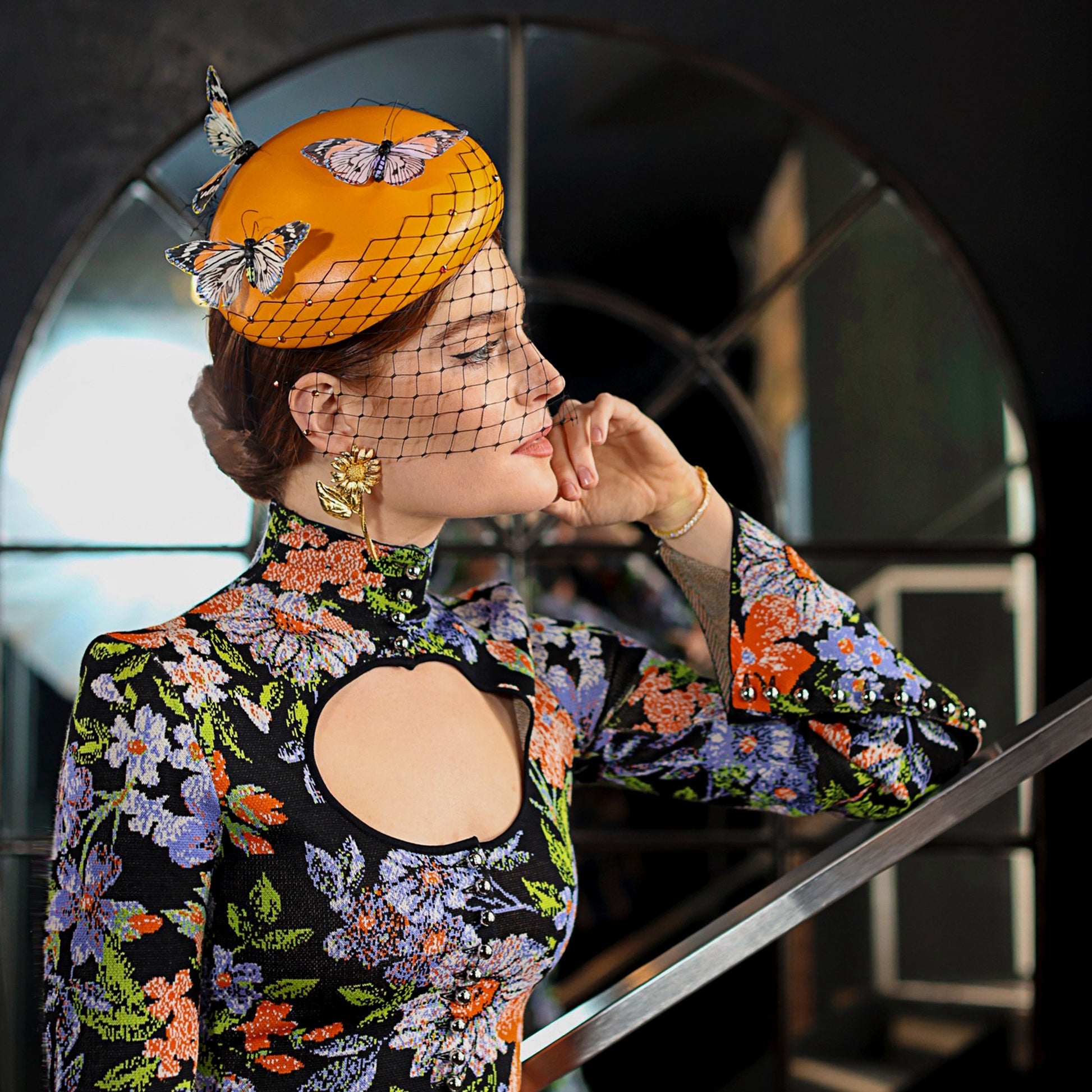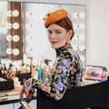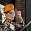 Introducing the Artistic Metamorphosis hat; a breathtaking side beret blocked from a luxurious burnt orange leather. It has been adorned with three vibrant feather butterflies artfully scattered around the base and embellished with delicate veiling and sparkling crystals. This exquisite piece exudes elegance and charm.