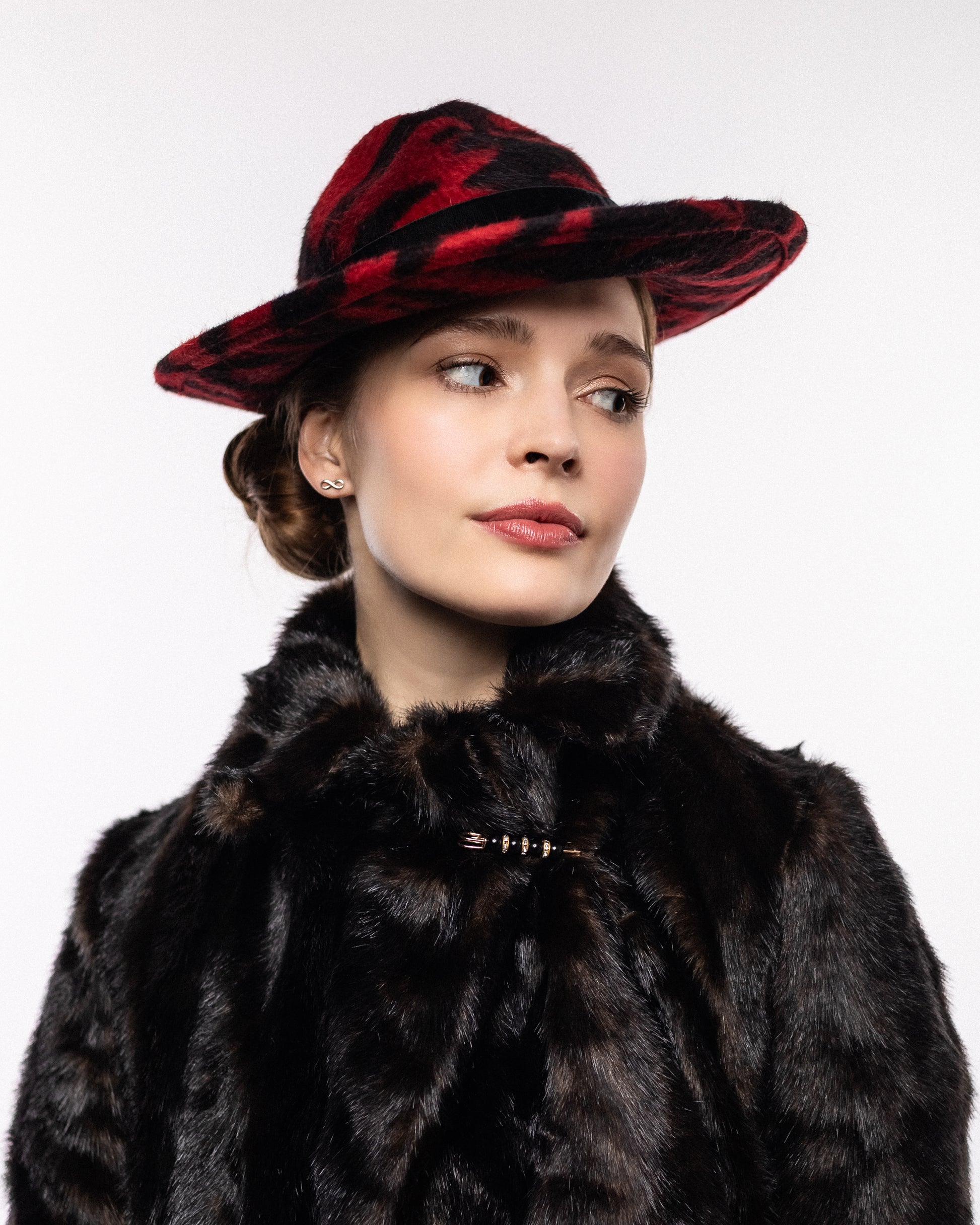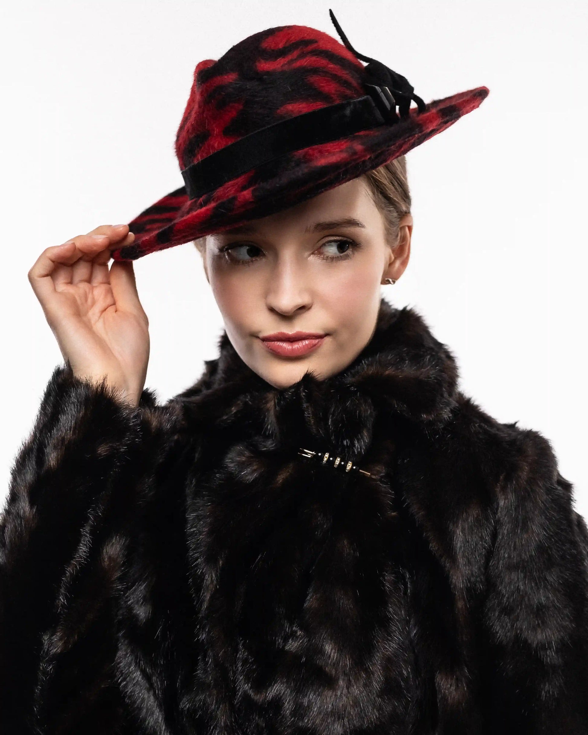 Make a bold statement with Brume, a striking headpiece crafted from luxurious long-haired velour felt in a dramatic red and black animal print. The soft texture and deep tones create a sense of refined opulence, while a sleek velvet band and delicate side embellishment add subtle sophistication. Designed to perch elegantly on the head, this sculptural fedora blends contemporary artistry with timeless glamour. It is perfect for the races, winter weddings, or a standout seasonal style.