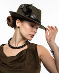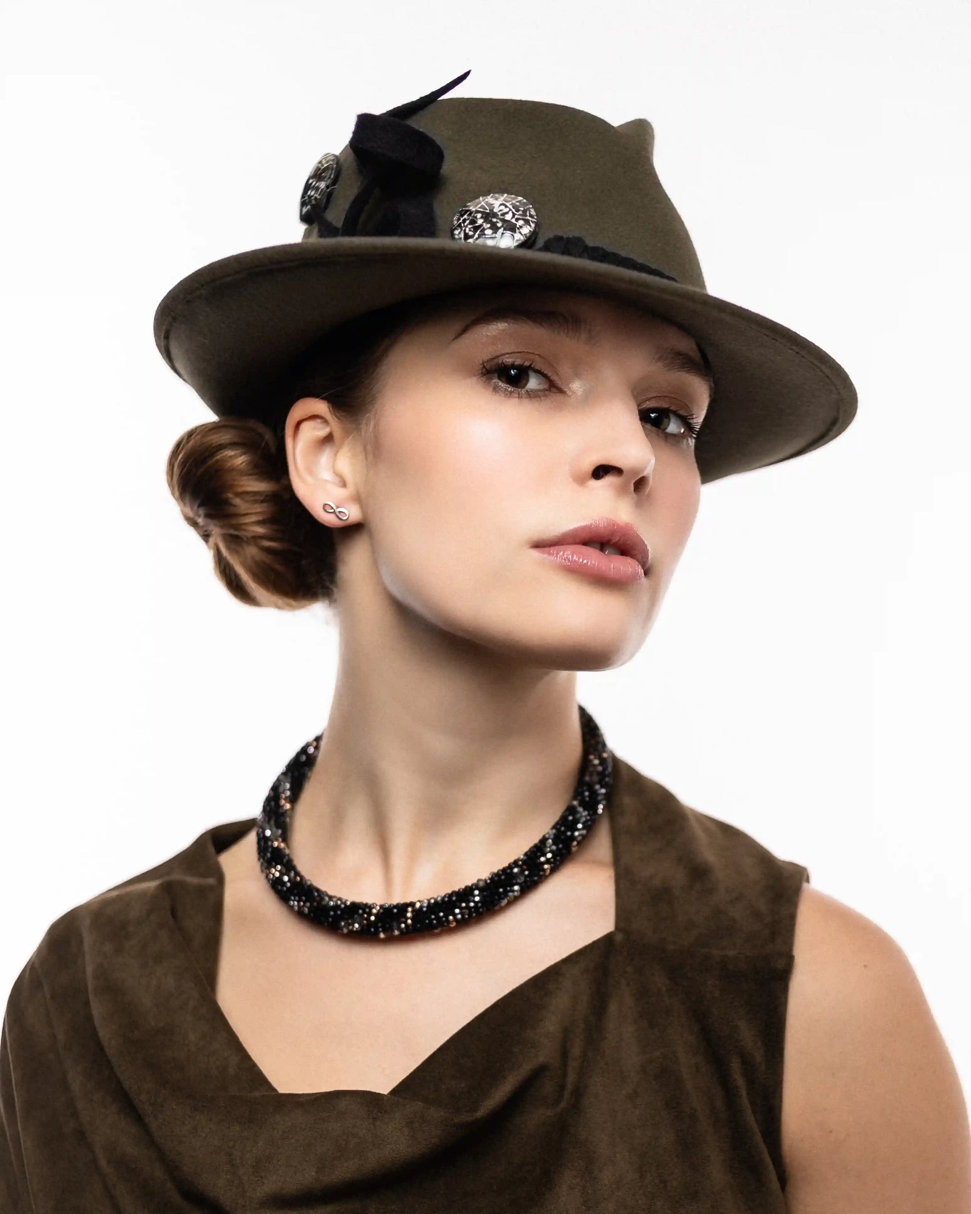 Crafted from luxurious forest green velour felt, this elegant hat exudes timeless charm. It’s adorned with a soft black felt sculptural knot and finished with two vintage patterned buttons that add a touch of character and sophistication. Perfect for those who appreciate classic style with unique, handcrafted details.
