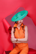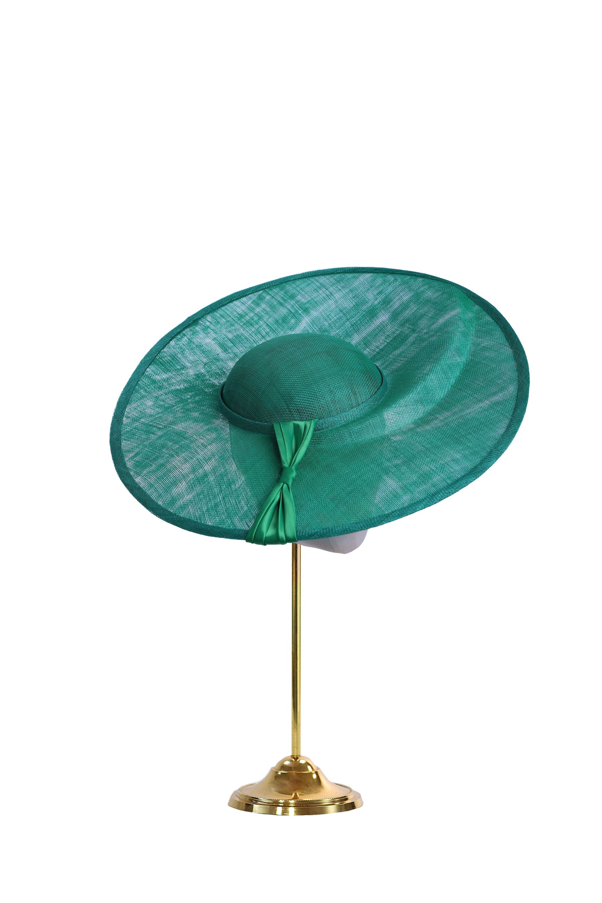 This exquisite bright green saucer hat features an elegant silk bow delicately positioned atop the brim, complemented by a matching bow beneath. Designed for distinguished occasions such as racing events, weddings, and other special gatherings, this headpiece offers a sophisticated and stylish statement.