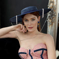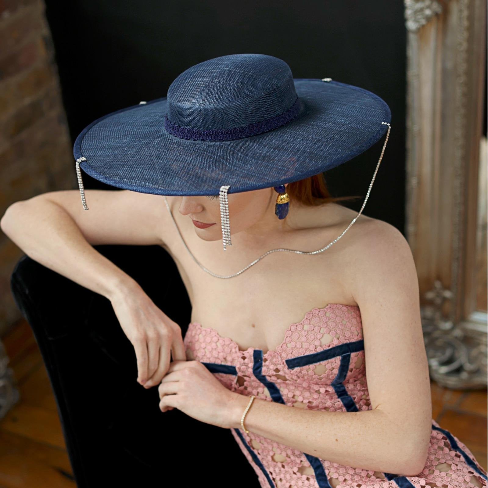 Step into timeless elegance with our exquisite Boater hat. Meticulously crafted from sinamay and adorned with delicate crystal beads cascading along the brim, it exudes sophistication. Finished with a graceful chain that drapes from one side of the face to the other, this hat accentuates your features with undeniable charm