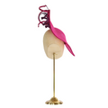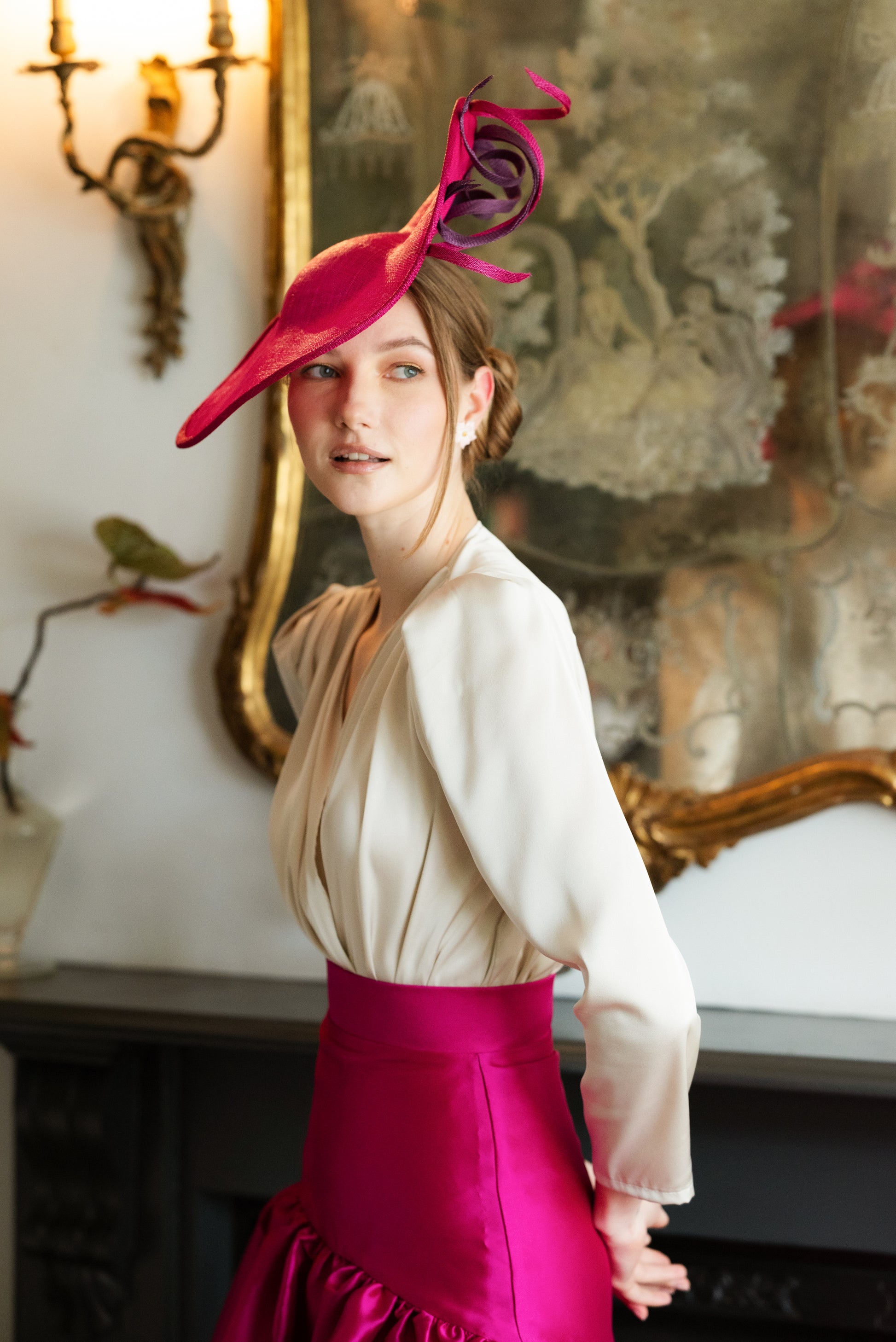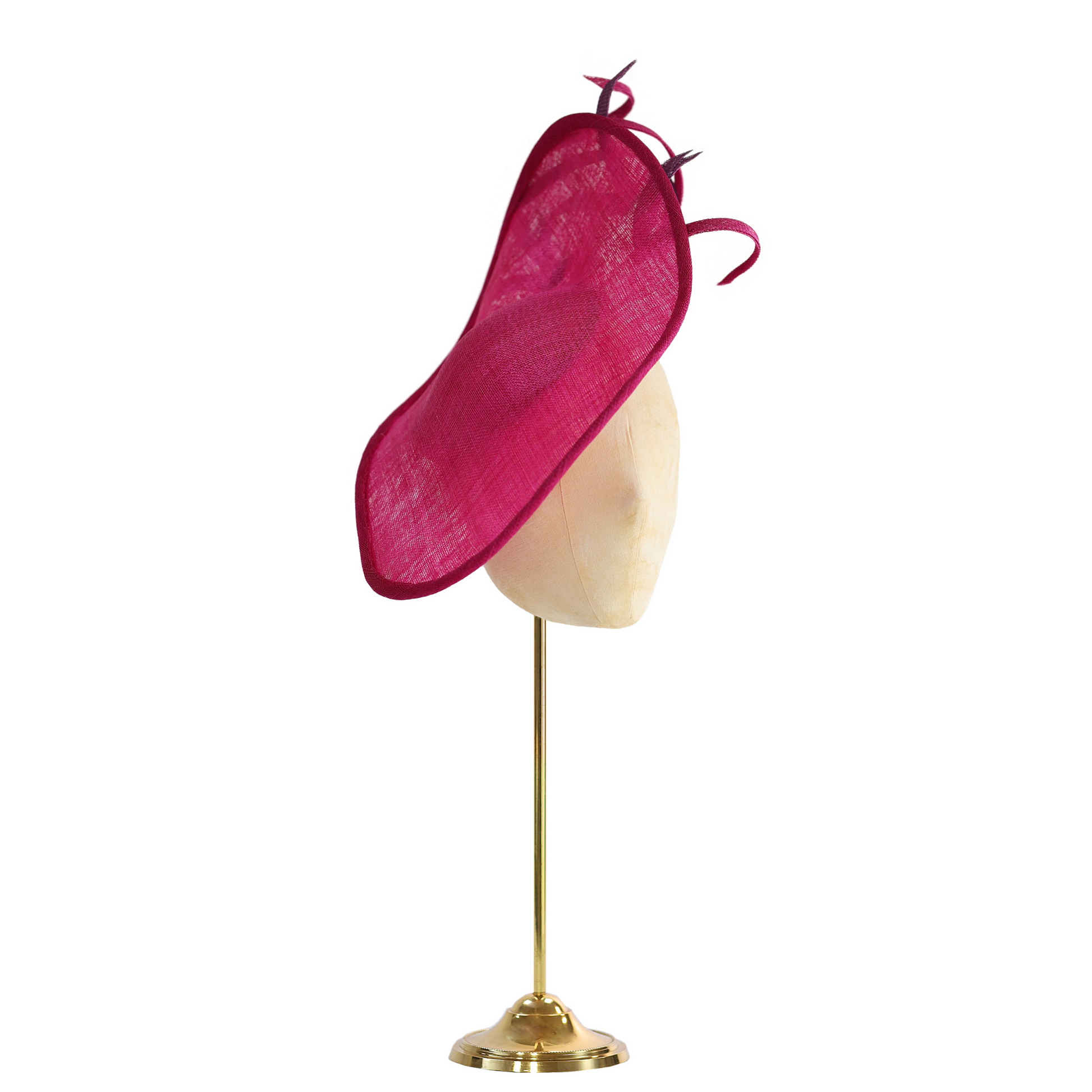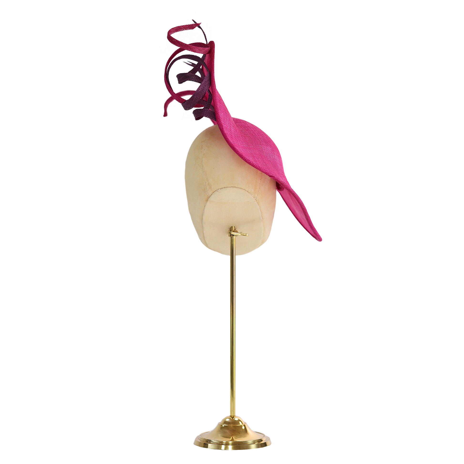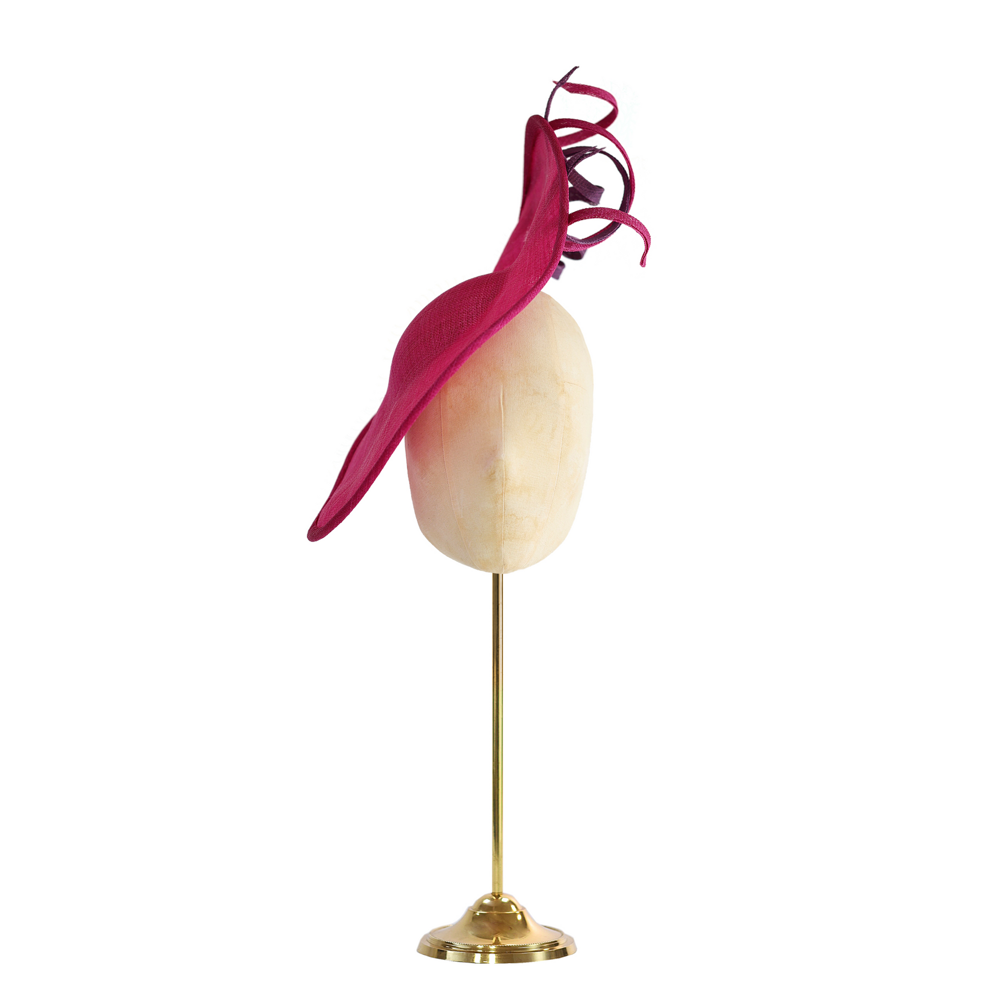 Inspired by a tipping balance, this vibrant fuchsia side sweep headpiece is made from luxurious Sinamay and embellished with two-toned Sinamay swirls that decorate the headpiece's right underside.