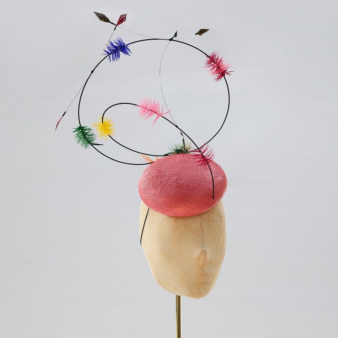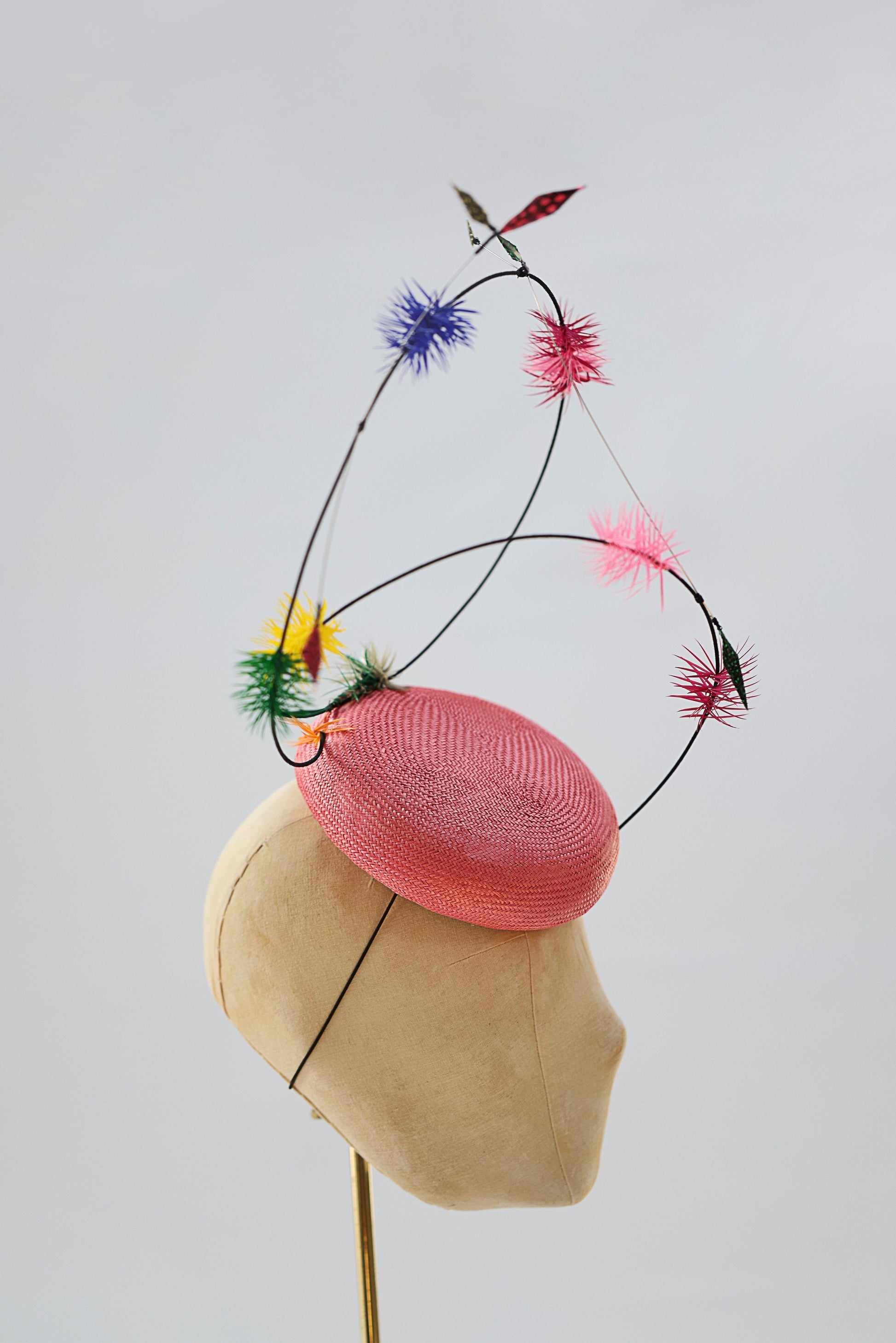 Funfair is a colourful, fun and extravagant button headpiece made from Parasisal straw, embellished with biot and guinea fowl feathers. This hat brings to mind the dips and twirls not only a funfair ride has, but also the ups and downs of life.