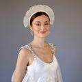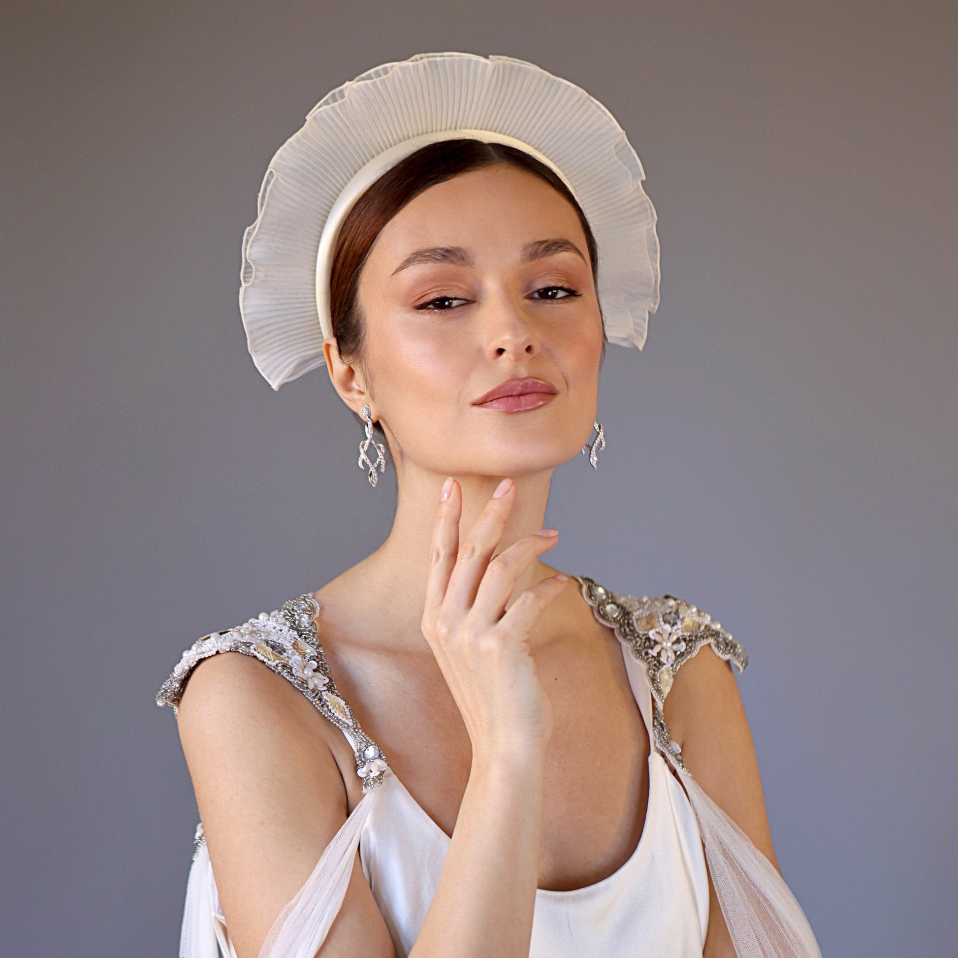 A luxurious white satin headband adorned with a translucent pleated organza halo.