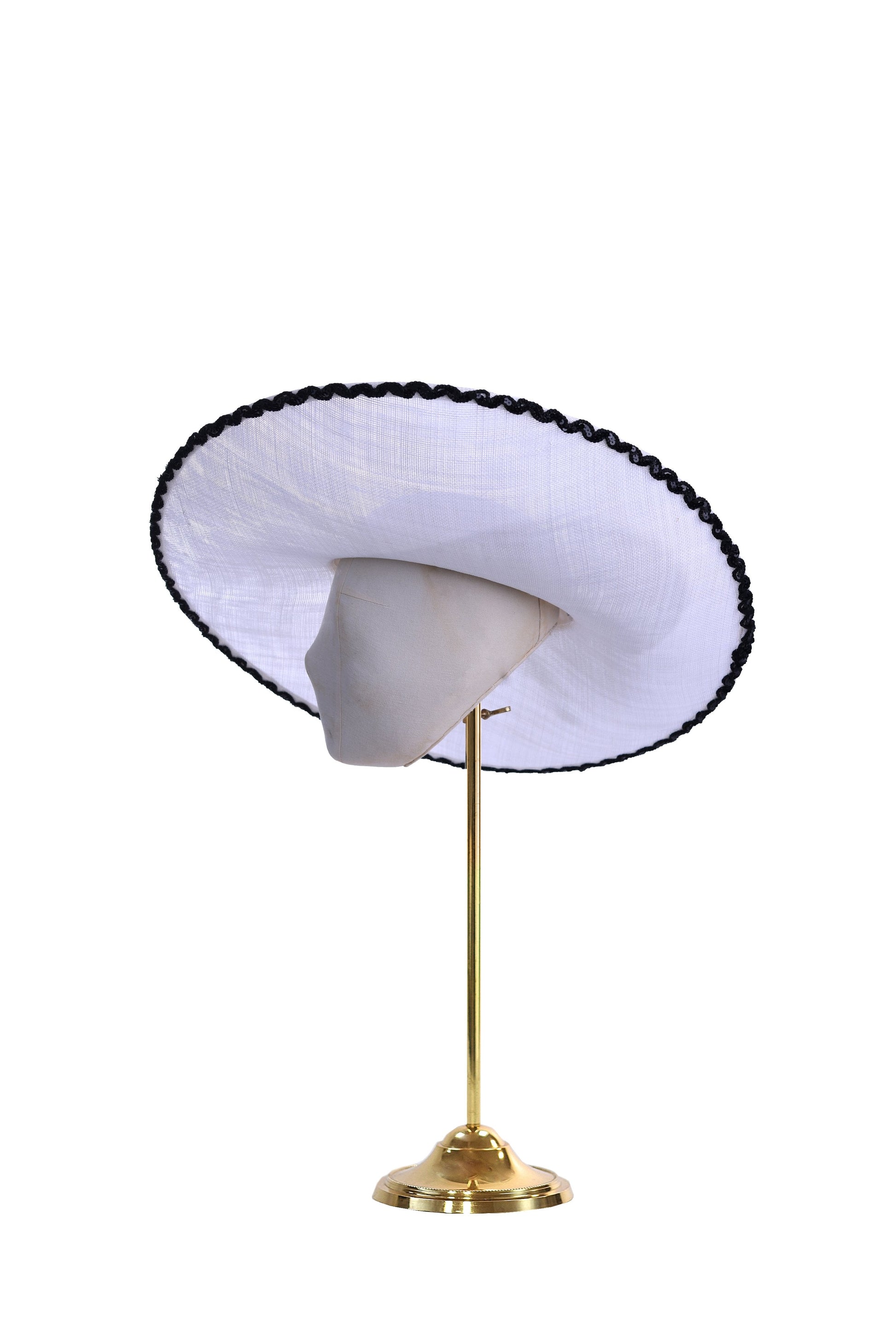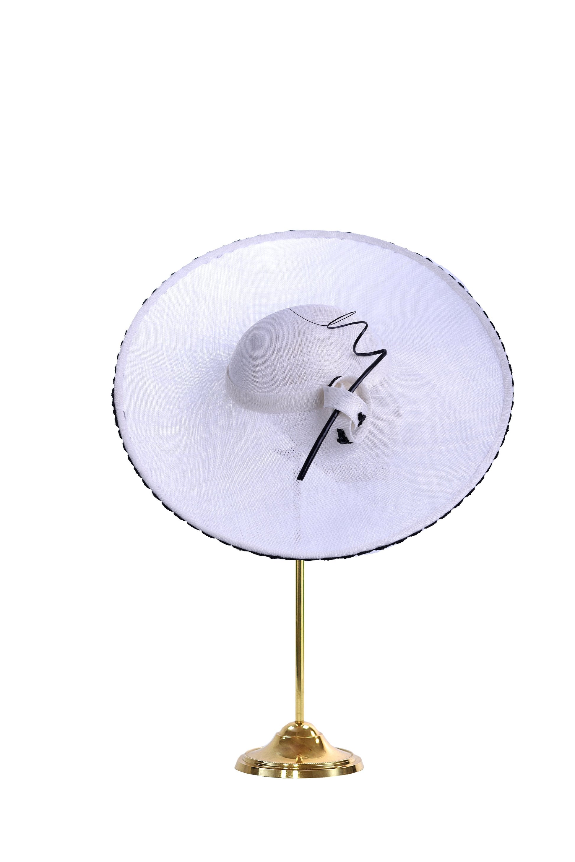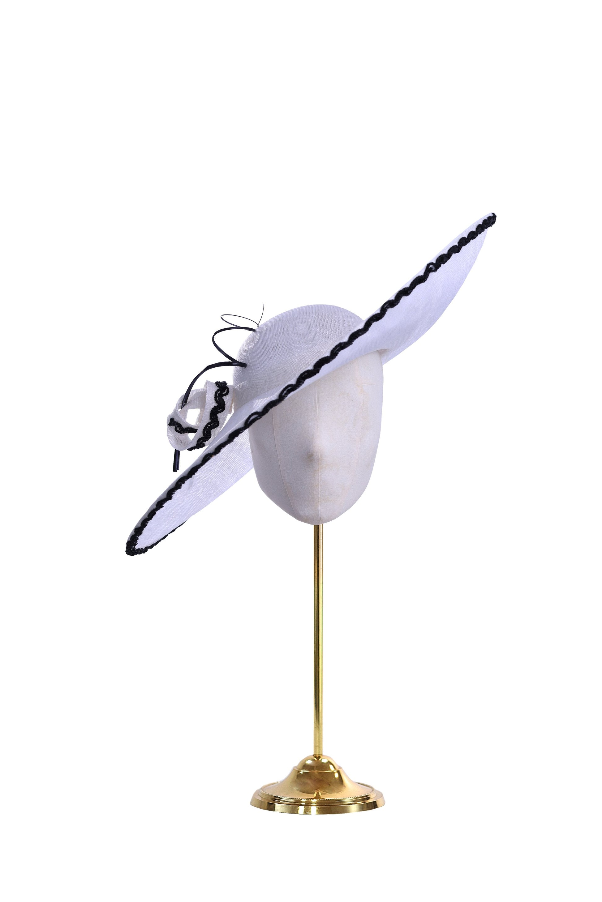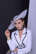 A stunning oversized white side-sweep hat, featuring a sophisticated black sequinned edge on the underside, which adds a touch of sparkle and contrast. The hat is beautifully accented with a curled black quill and a chic white knot, both embellished with matching black sequins for a cohesive and glamorous look. Perfect for Royal Ascot, the races, or any elegant event. This hat combines timeless style with eye-catching details to ensure you stand out in the crowd.