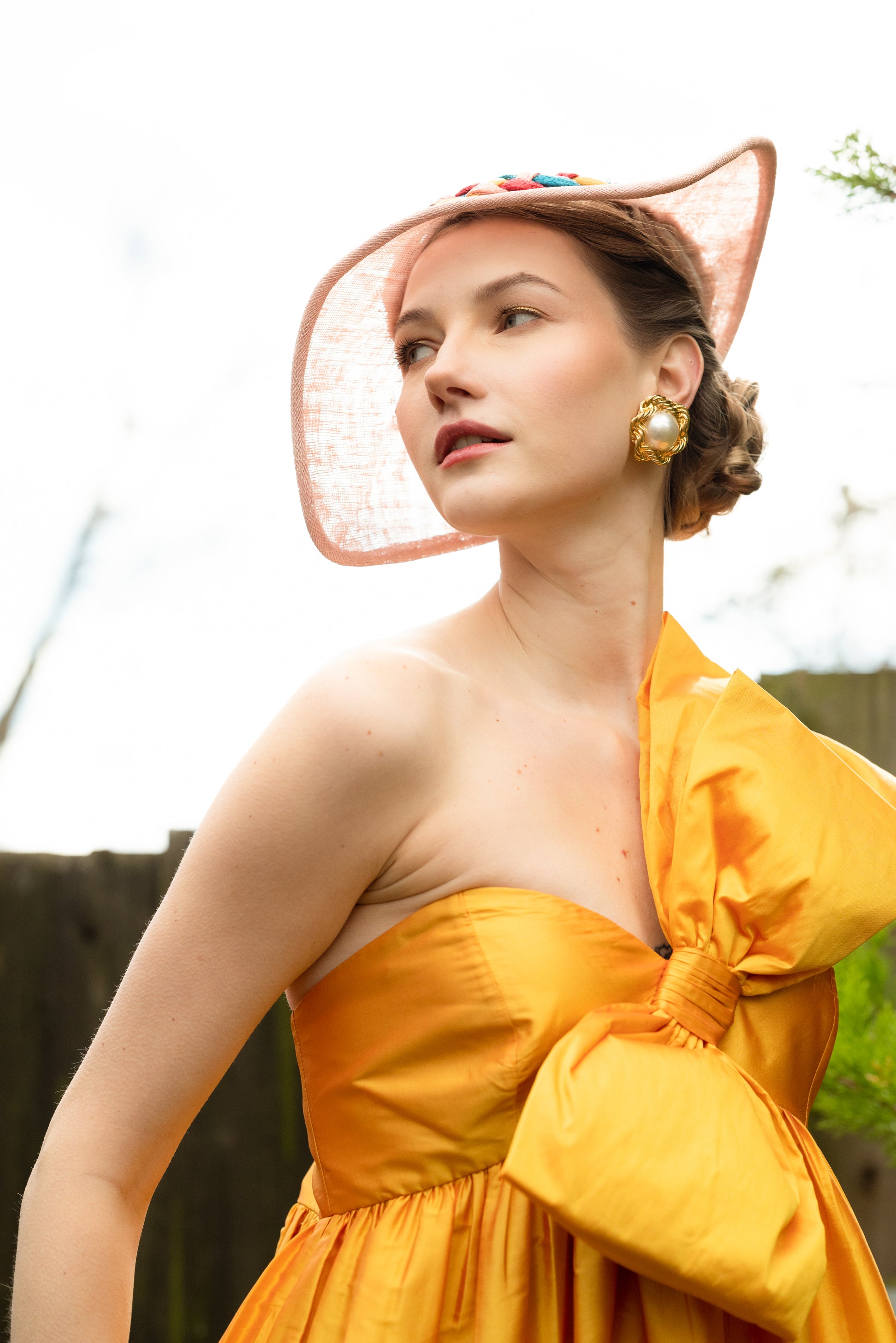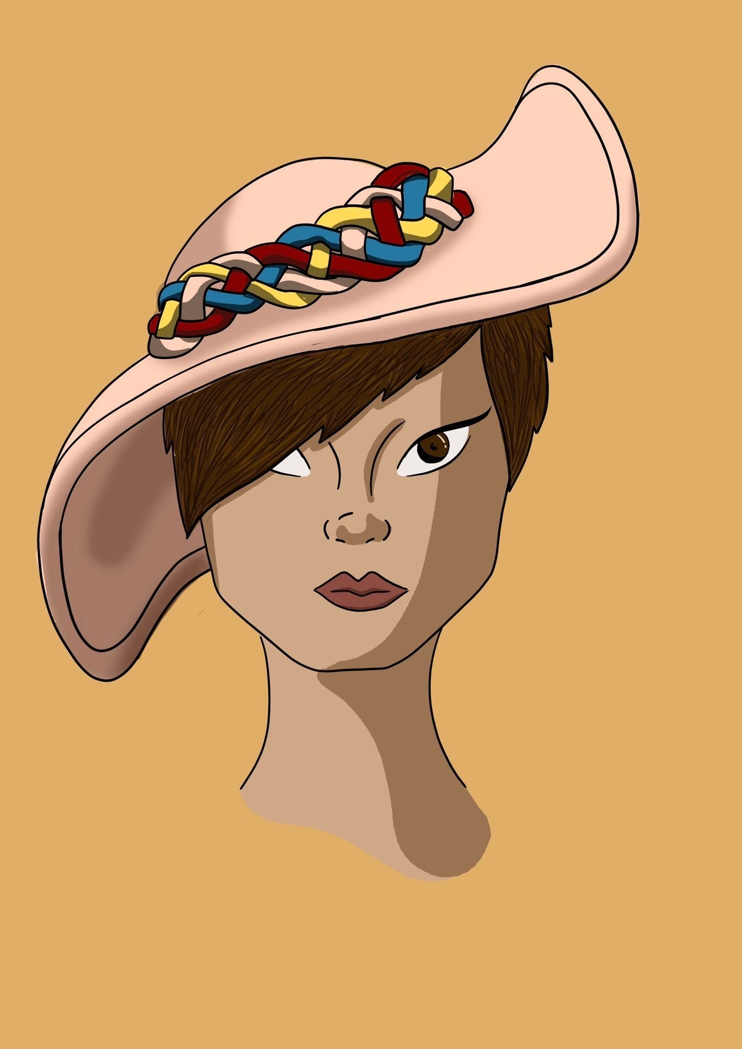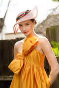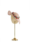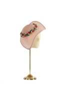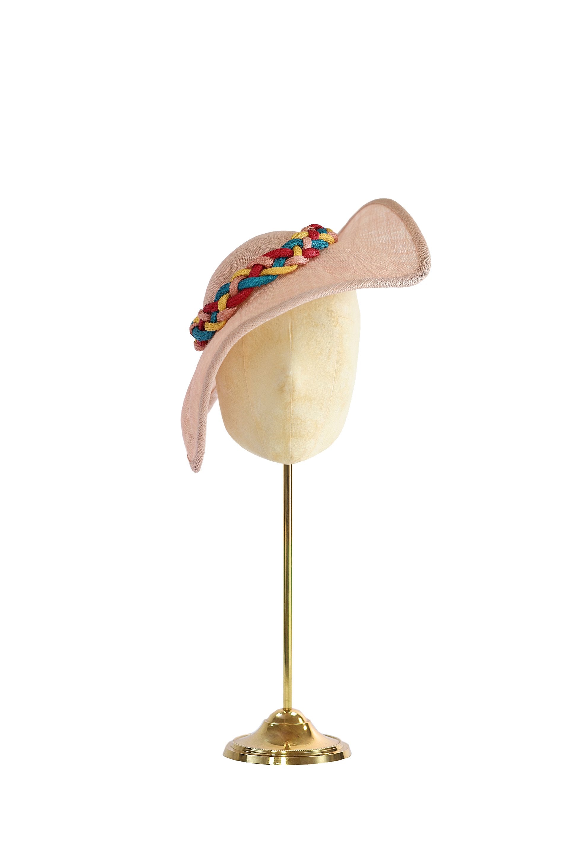 Inspired by the buoyancy force. The Intrepid headpiece is a hand-blocked nude-coloured asymmetric headpiece decorated with a multi-coloured straw plait woven around the crown.