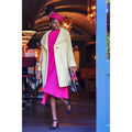 The Latisana headpiece is an elegant pillbox made from the softest peachbloom felt and adorned with a ruffle embellishment made from a multi-coloured French vintage fabric.