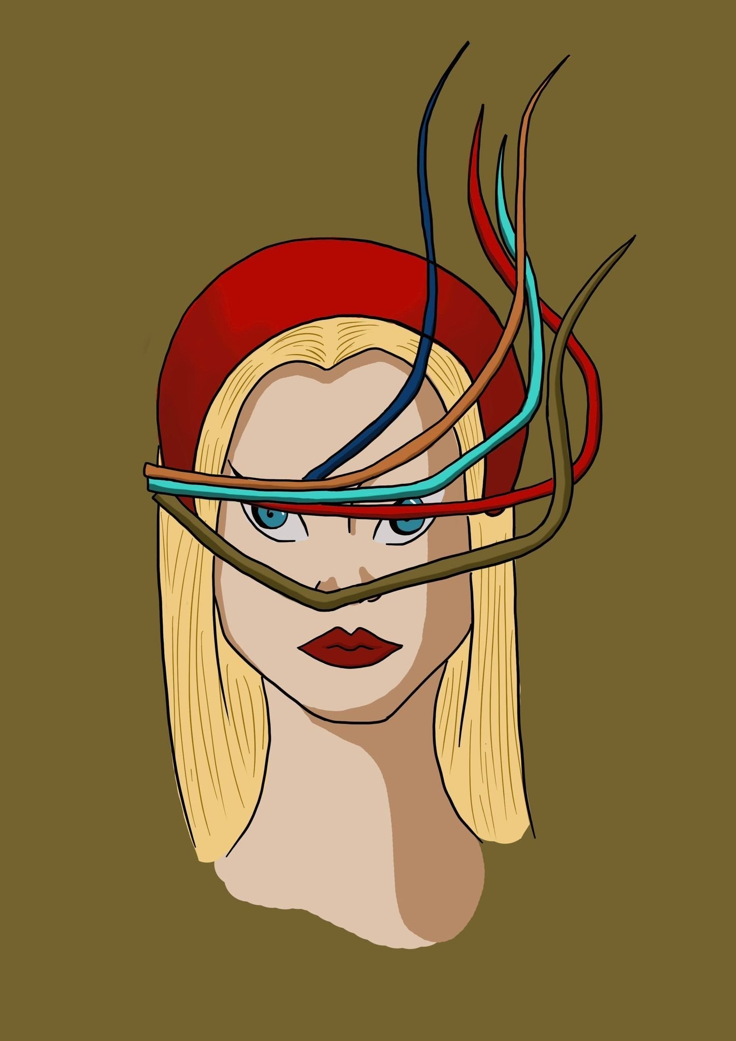 Inspired by the wind whooshing through branches forcing a tree to remain firm when swaying back and forth. The Ramify headpiece is made from a hand-blocked wide halo band and embellished with 5 different coloured quills which float across the face.