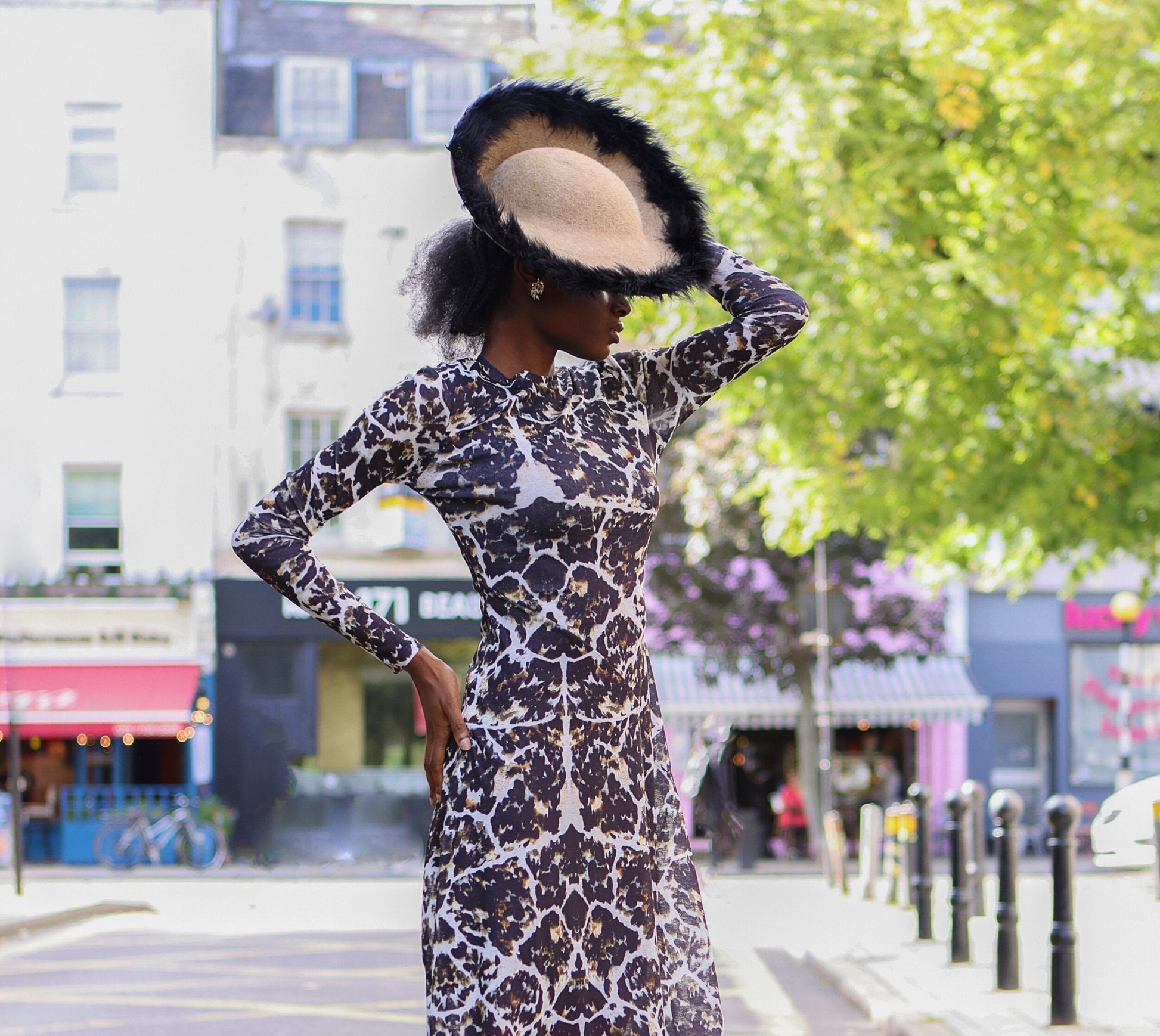 The Rialto headpiece is an oversized caramel coloured peachbloom felt disc, adorned with floating black marabou feathers.