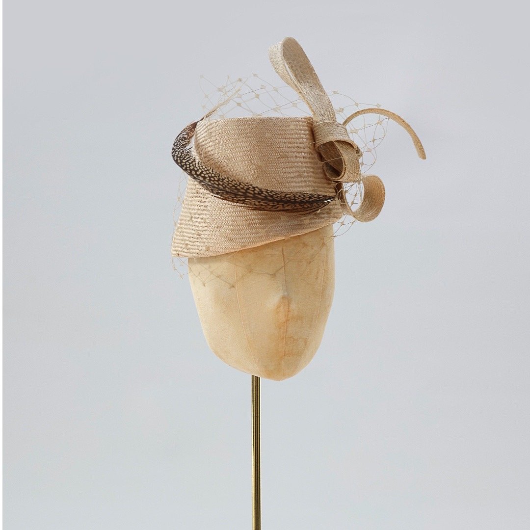 A hand-dyed Parasisal straw hat, embellished with a single Lady Amhurst pheasant feather and colour matching veilling.