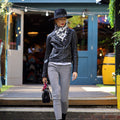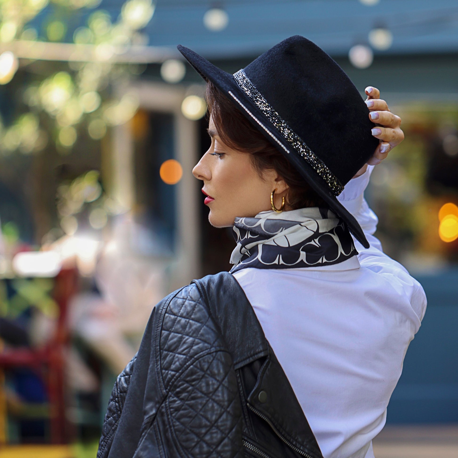 The Schiara fedora has been made with a jet black luxurious peachbloom felt and adorned with silver and black beading around the crown as well as part of the brim. It is a timeless and classic headpiece perfect for the winter months.