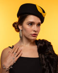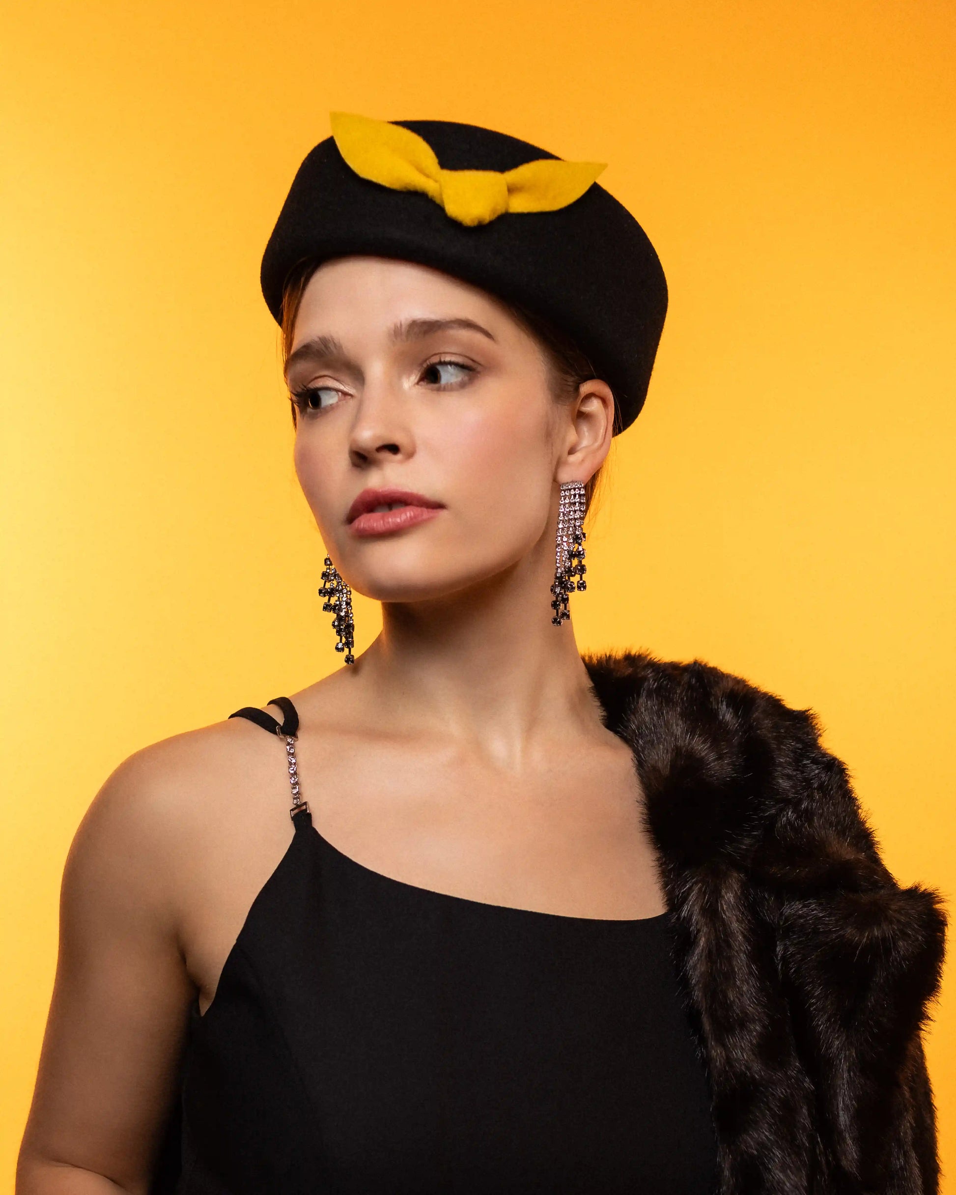 Chic and timeless, this elegant pillbox headpiece is crafted from sumptuous black velour felt, offering a smooth, luxurious texture and refined silhouette. A bold bright yellow embellishment sits gracefully at the front right, shaped into a modern love-heart bow that adds a contemporary, playful edge to its classic form.