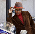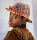 The Solaro trilby is a symmetrical patterned brown and cream peachbloom velour felt hat, which has been decorated with a contrasting terracotta band and twisted loop.