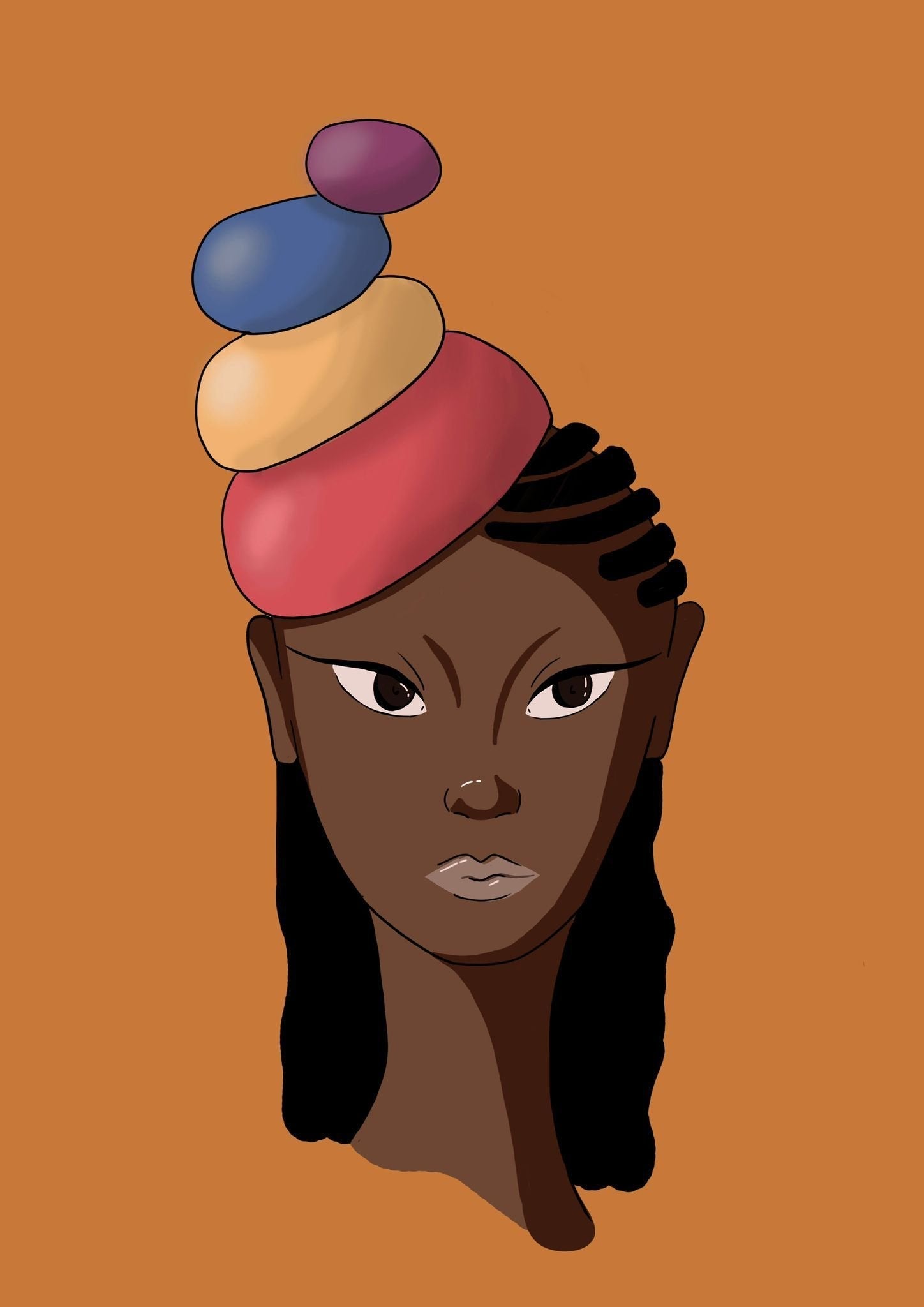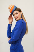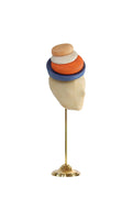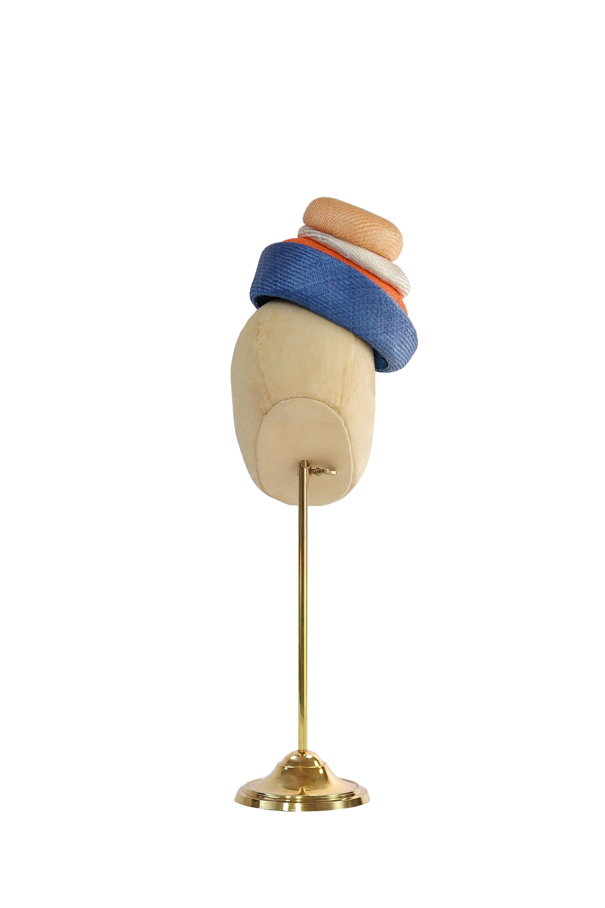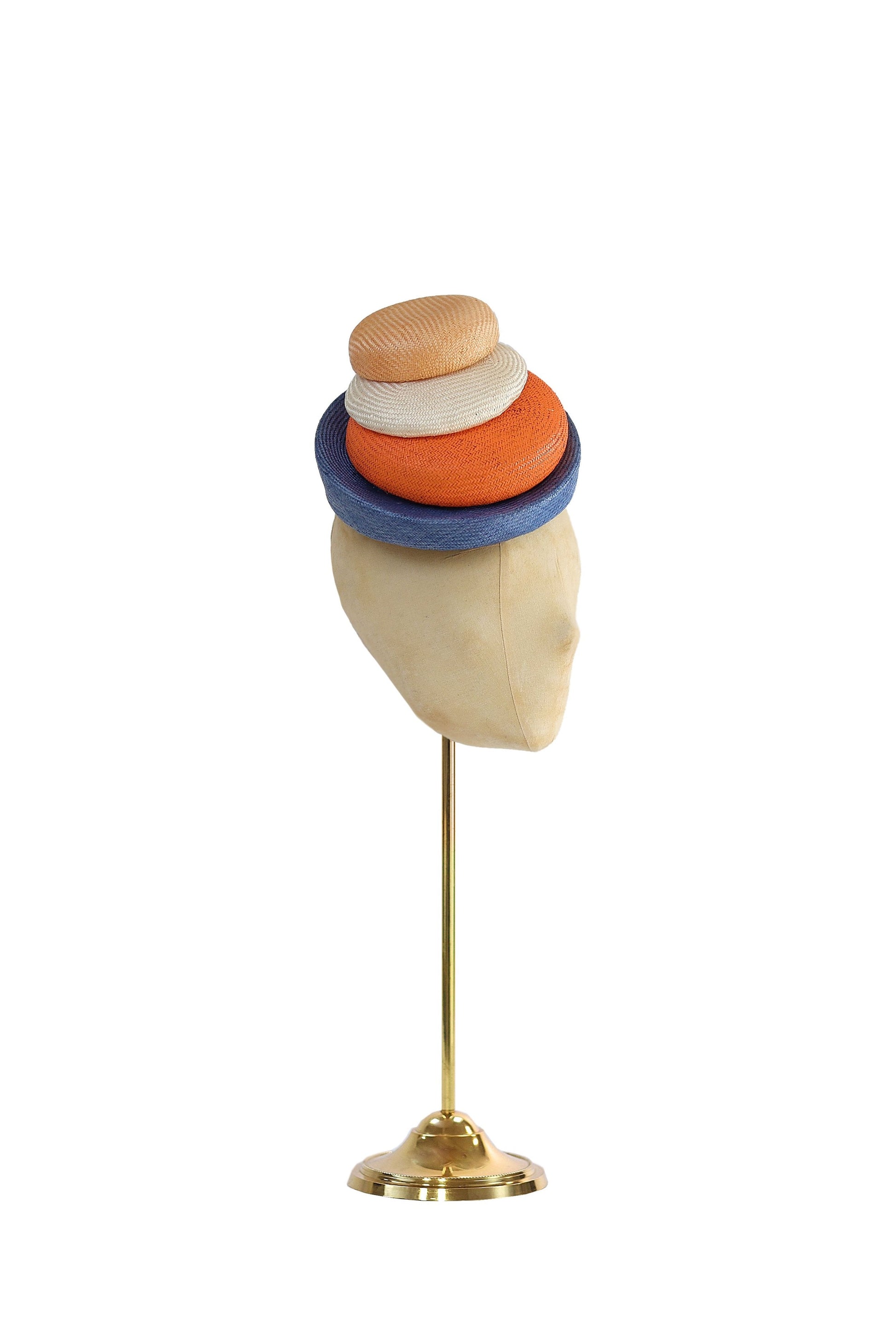 Inspired by the art of stacking uneven stones. The Stasis headpiece comprises of four Parasisal button headpieces, hand blocked in different sizes and colours, and hand sewn onto each other to create a colourful tower.