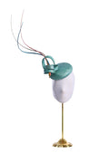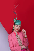 A sculptural green button headpiece, beautifully crafted to add a touch of sophistication to any ensemble. It features three vibrant floating quills in amber, teal, and pink, artfully gathered into a chic knot. Each quill is delicately decorated with three tiny pearls at the tips, adding a subtle shimmer and intricate detail. Perfect for making a refined yet eye-catching statement, this headpiece combines craftsmanship and elegance.