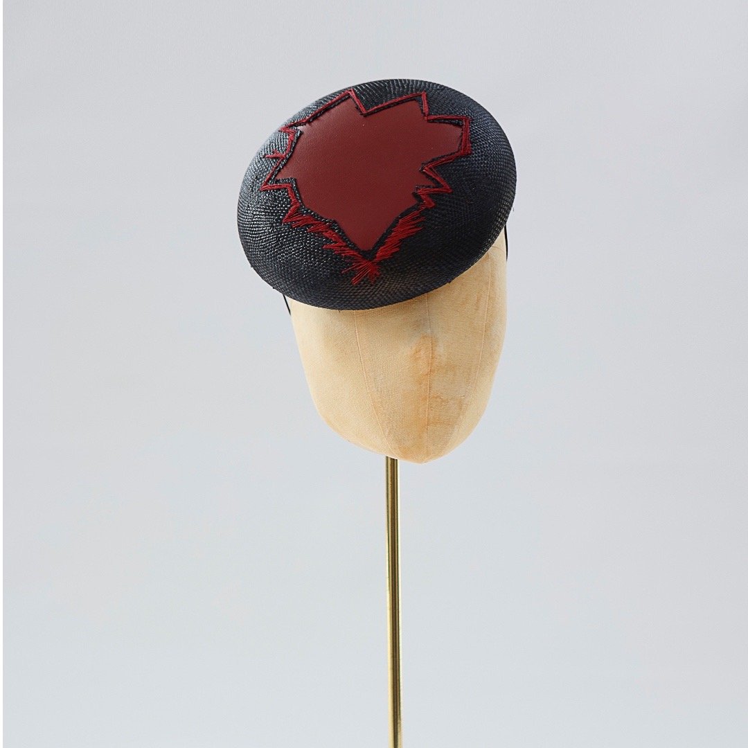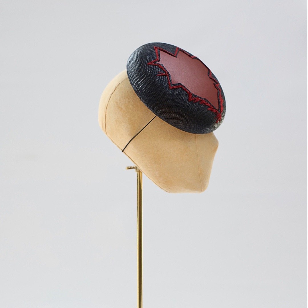 Unwrapped is made out of a red silky leather and blue Visca straw. It was designed to represent two hands, tearing a wrapping paper in opposite directions, showing the inside for the first time.