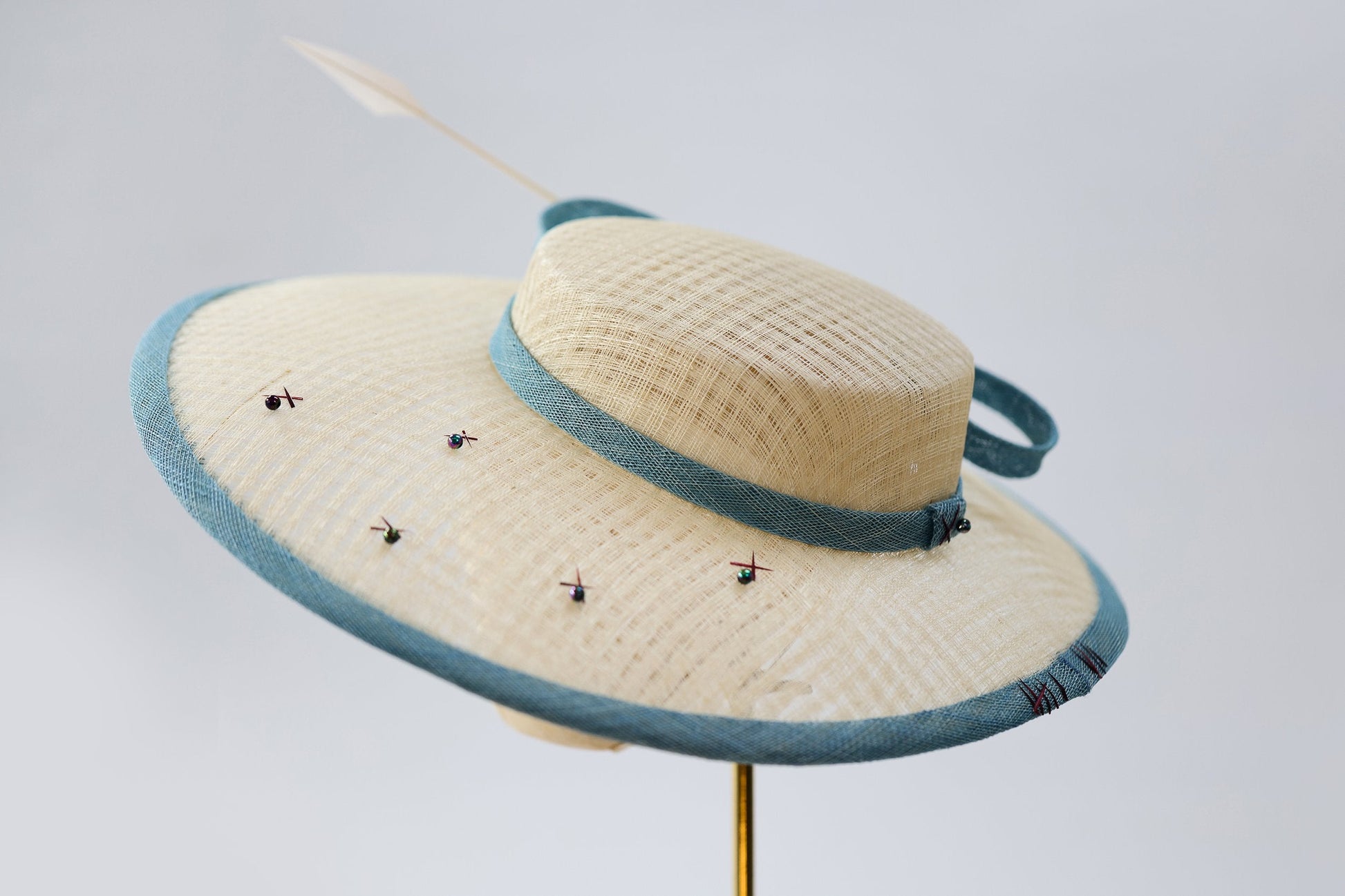 What childhood game captures the attention of both children and adults alike? A game unlike most, that can be played anywhere. Only one game comes to mind, naughts and crosses. This timeless game brings endless hours of fun to anyone taking part. The boater headpiece is made out of Windowpane Sinamay, Iridescent beads, and an Arrowhead quill.
